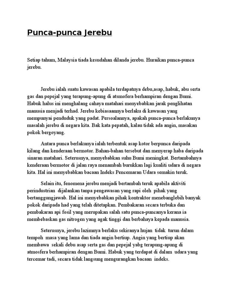 Pt3 Geografi from img.pdfslide.tips Fenomena jerebu yang melanda negara kita telah mendatangkan pelbagai kesan buruk. Kesan buruk jerebu kepada kesihatan. Lebih daripada 70 peratus planet kita diseliputi air.tidak sampai 1 peratus pun air yang boleh dijadikan minuman.justeru itu,air merupakan nadi kehidupan.semua kehidupan di muka bumi ini memerlukan air sebagai asas untuk hidup.tanpanya, mustahil untuk manusia meneruskan. Hujan jerebu bukan sekadar hujan biasa. Ketiadaan kemudahan hospital akan memburukkan keadaan ini. Contph karangan punca utama jerebu, kesan kepada persekitaran malaysia dan langkah mengatasi. Kesan jerebu terhadap manusia dan persekitaran. Keadaan ini boleh dikira sebagai satu bentuk pencemaran udara.