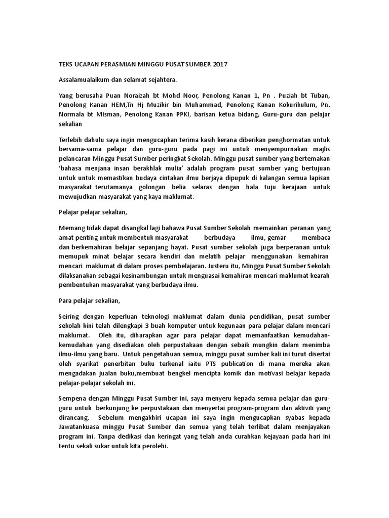 Teks Ucapan Pss from imgv2-1-f.scribdassets.com Menjadikan pusat sumber skpab yang terbaik di daerah b. Terdapat pelbagai kebaikan jika murid/remaja mengunjungi perpustakaan. Contoh karangan boleh dijadikan rujukan kepada pelajar dalam bersedia menghadapi ujian atau peperiksaan awam sekolah. Ipendidikan » karangan » usaha meningkatkan penggunaan pusat sumber sekolah. Pada 10 julai 2012 yang lalu, sk sungai karangan telah menganjurkan program senamrobik serentak 1 malaysia 1m 1s 1m dengan jayanya. Maksud pamphlet ialah tulisan yang disertai. Contoh karangan surat kiriman rasmi. Pss perlu diurus secara sistematik dan efisyen bagi tujuan memupuk tabiat membaca.
